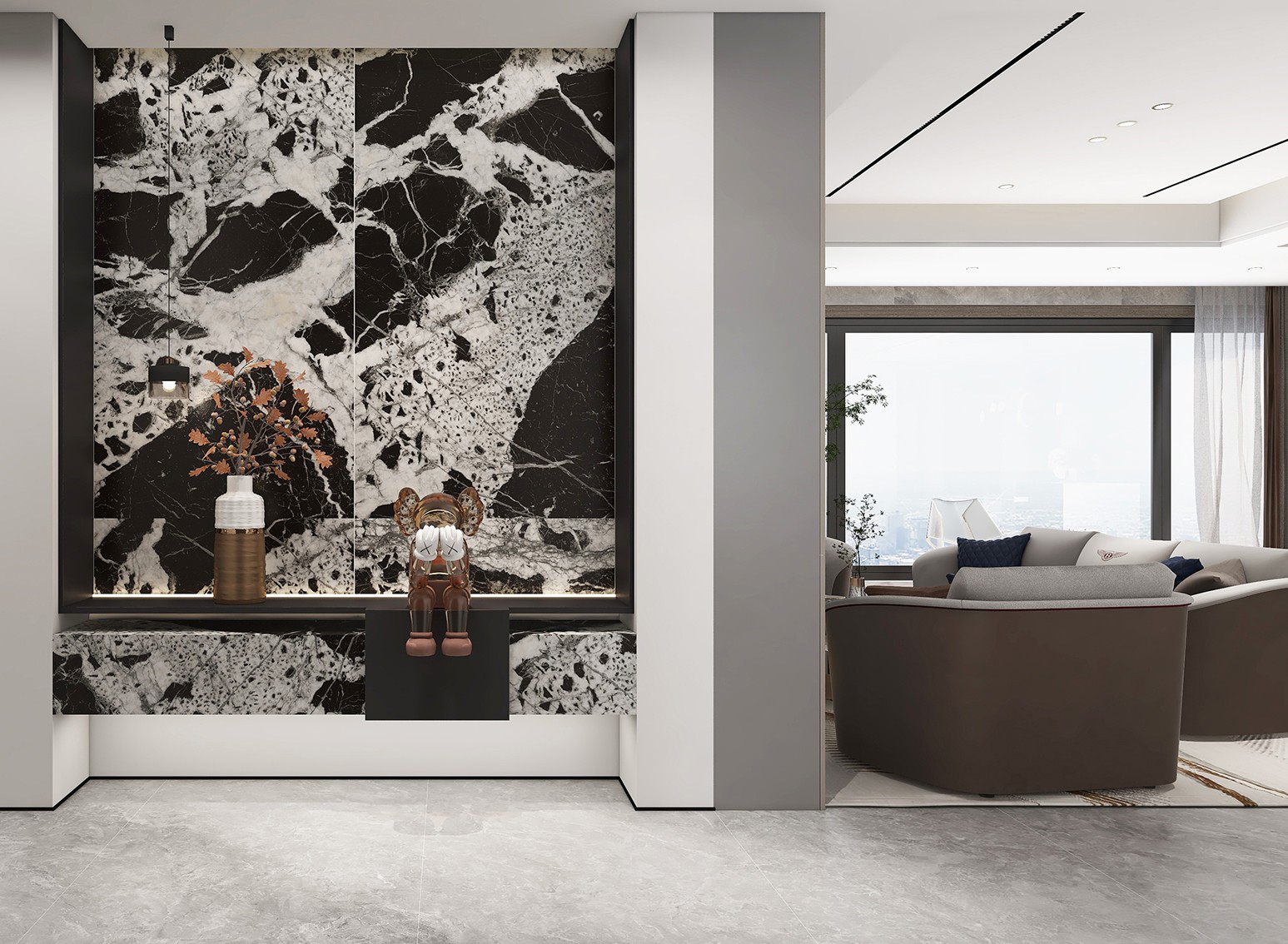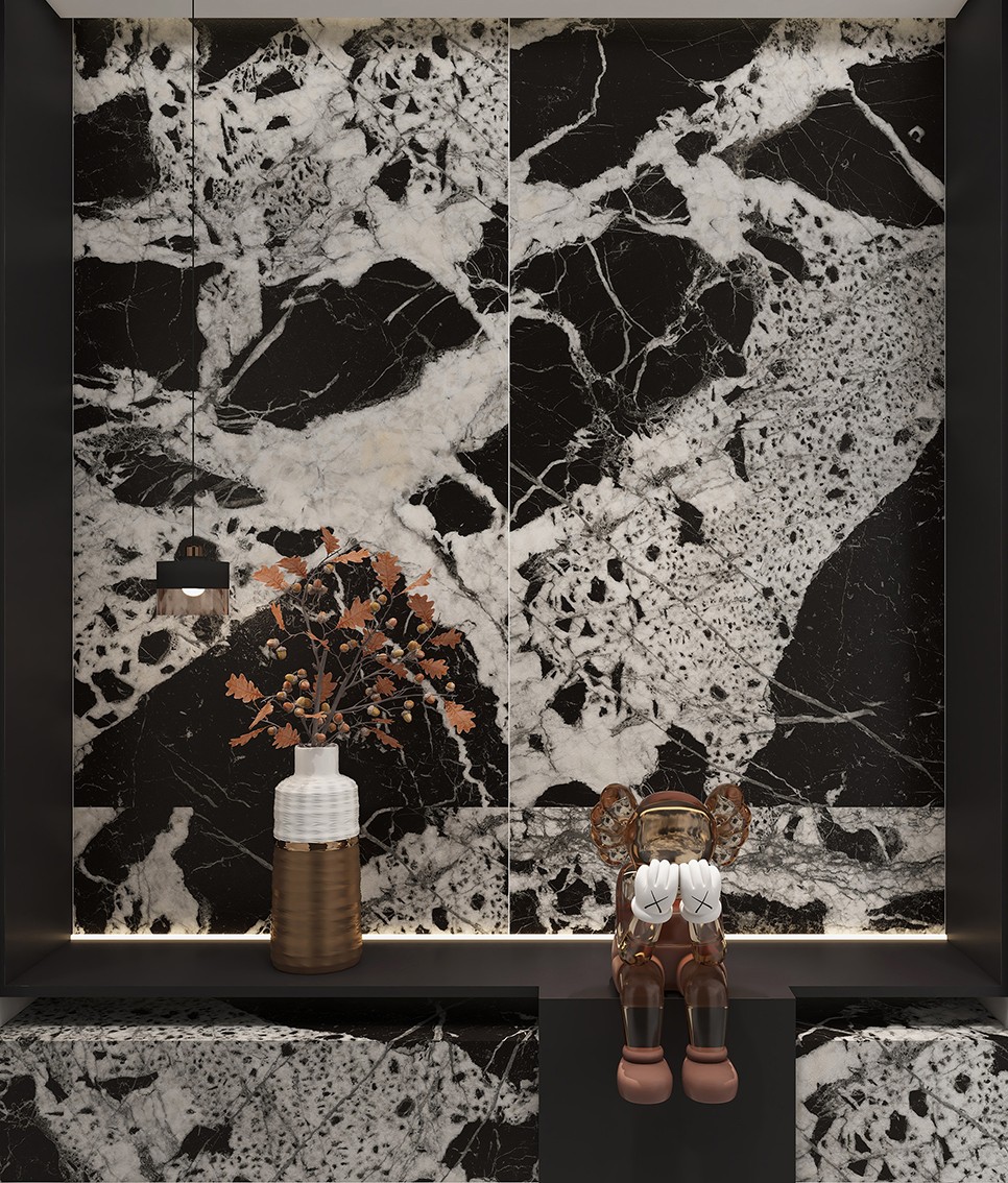 師造化系列以巖板為在載體,潑墨山水畫為靈感,大膽隨意勾勒壯麗山河景色,延綿千年的水墨意趣,或氤氳或渾厚,細膩質感,自在延伸,靈動自然,作為巖板背景墻,咫尺之間,山水如畫,沉淀儒雅逸趣。