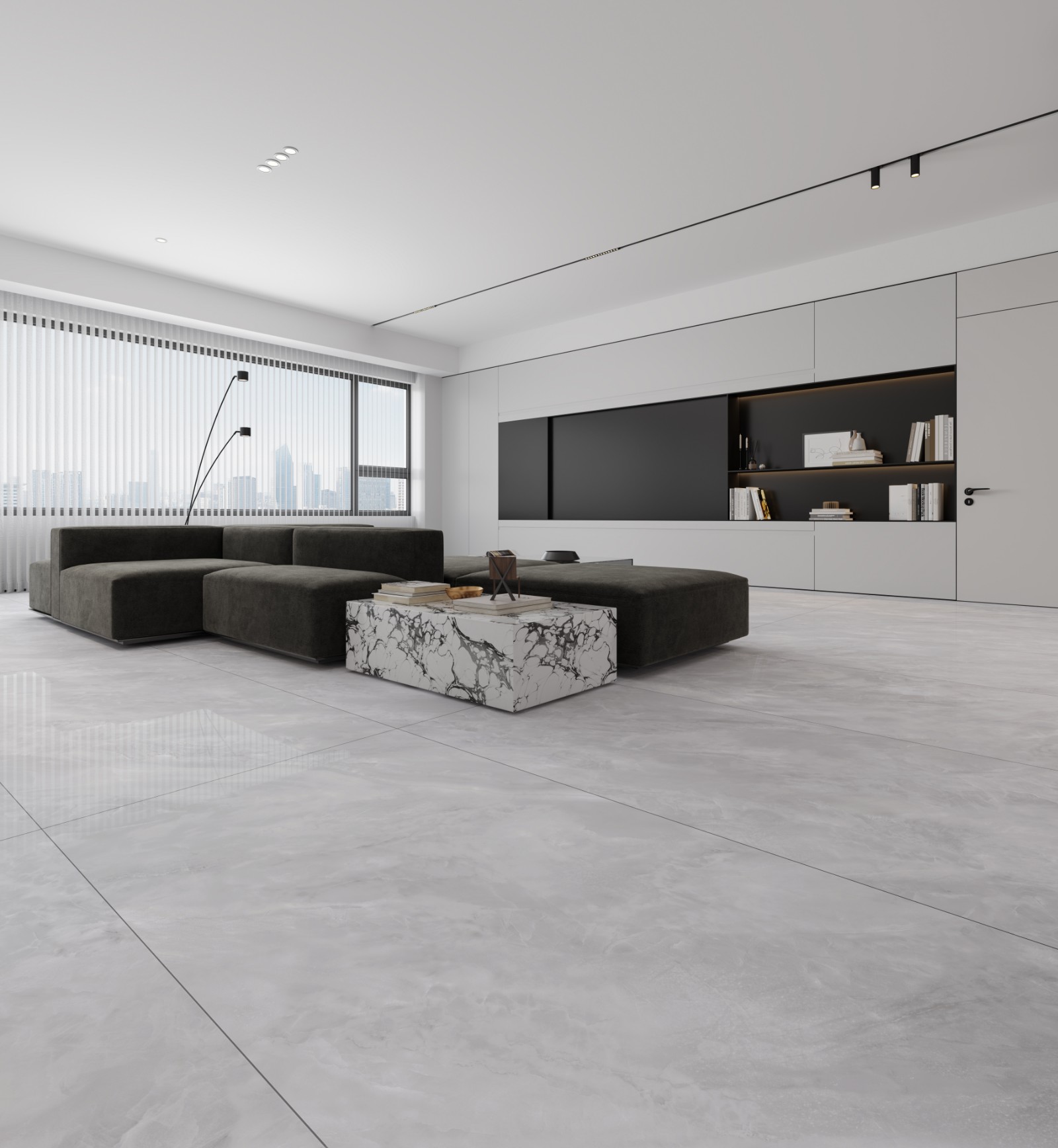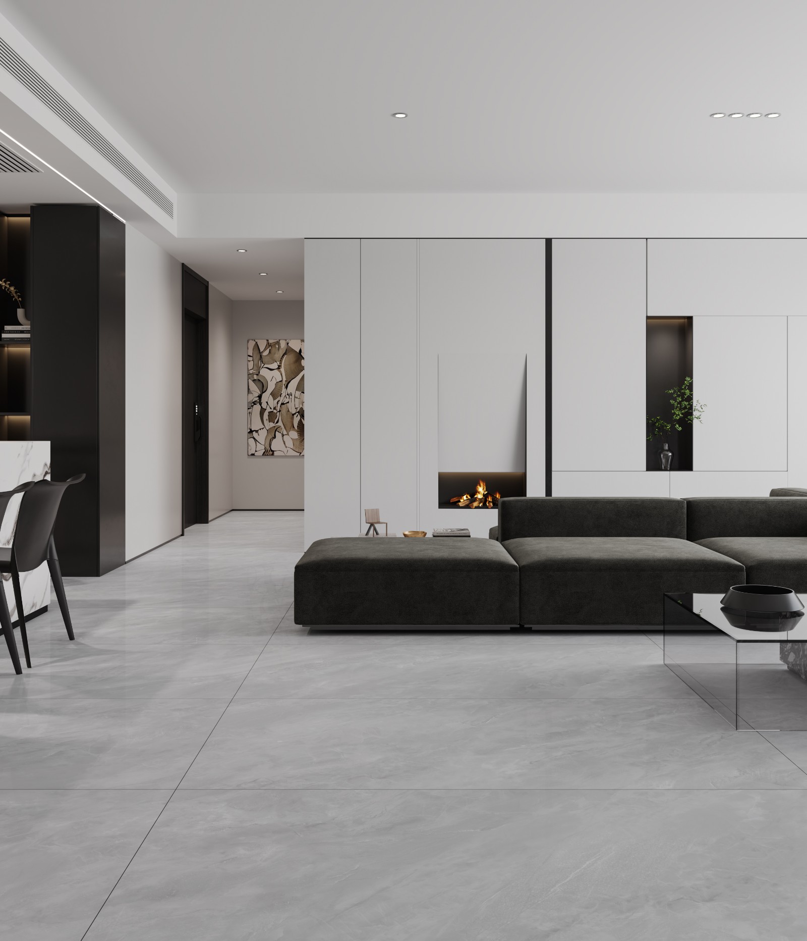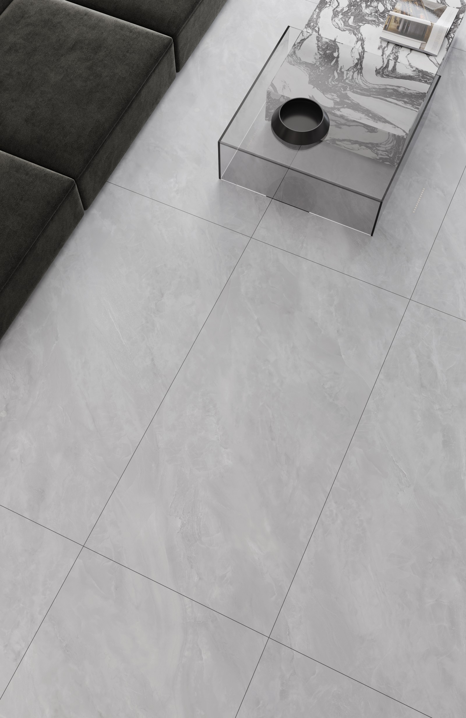 以灰白色淡雅的煙雨灰為主色調,搭配若隱若現的白色云霧壯紋理,磚面光潔細膩,觸感溫潤如玉,